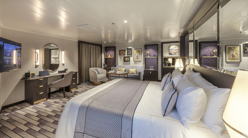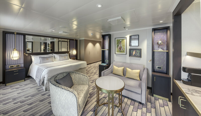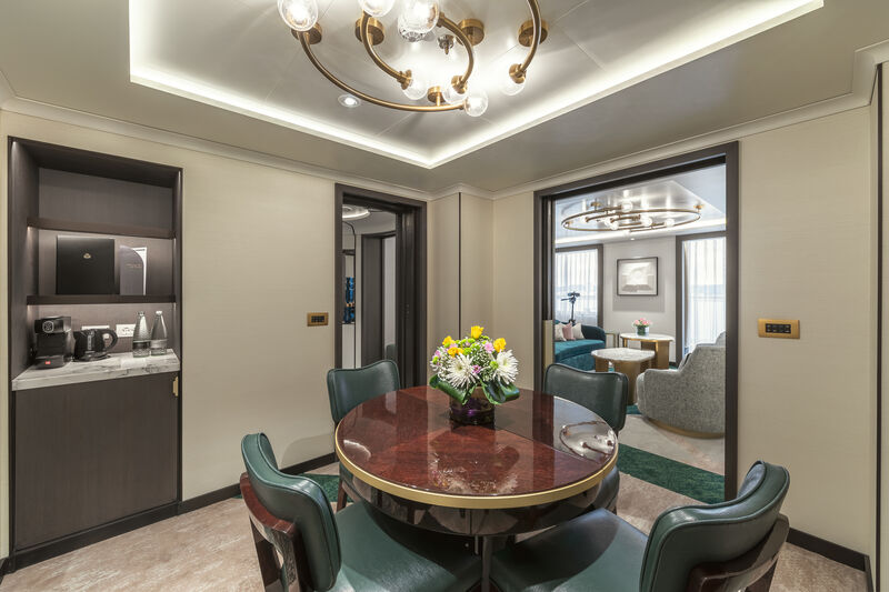 At approximately 896 square feet, the Queens Grill Master Suite is a refined retreat offering the ultimate in style and comfort. Guests enjoy privileged access to the Queens Grill restaurant with a dedicated reserved table, while the suite itself includes a welcoming reception hall leading into a Great Room with floor to ceiling windows, a private dining room, a generous lounge for relaxing or entertaining, and a serene bedroom with a Cunarder bed configurable as a king or two singles.